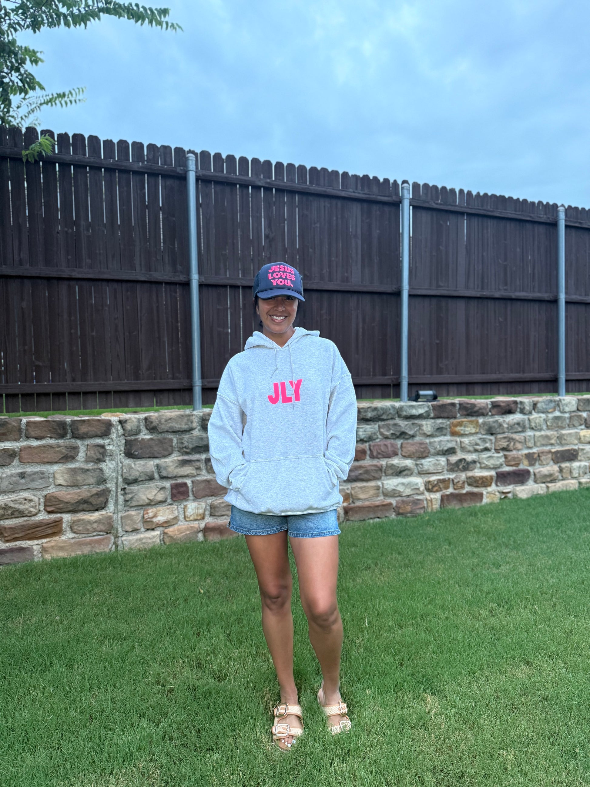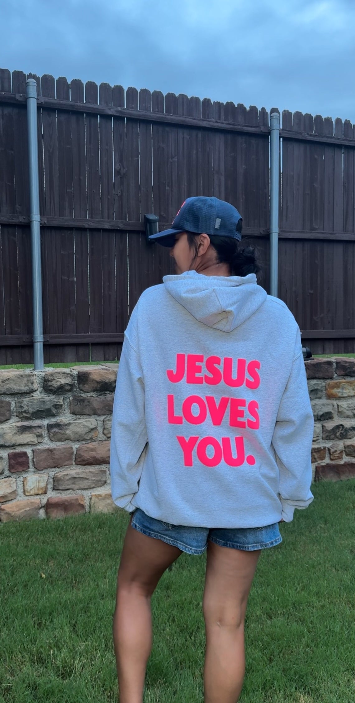 Ash grey Gildan hoodie with neon pink puff print on the front and back. These run TTS, I’m wearing a size XL. Ultra soft and lightweight.